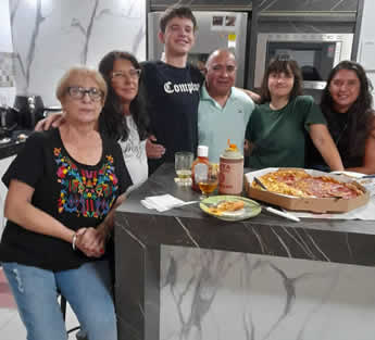 Graciela Ugartemendía y José Elpidio Romero con Gisa, Arthur, María Fernanda y Paula Caetano, en una nche de pizzas variadas y los tradicionales tragos de siempre.